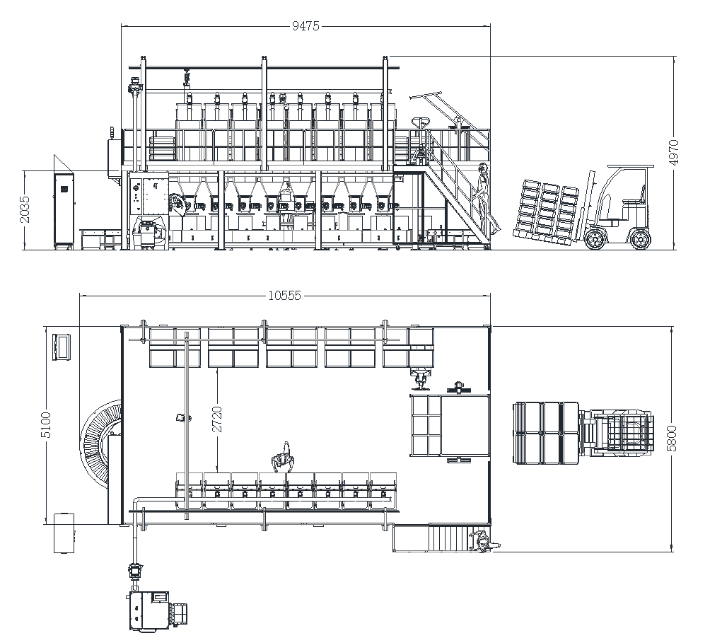 The multiple sets of feeders on this equipment can operate simultaneously. The feeding conveyor will automatically send the weighing buckets that have been weighed at the previous metering station to the next metering station. The operator only needs to place an empty weighing bucket on the conveyor at the entrance of the machine, and then take the weighed formula raw materials (weighing buckets) at the outlet end of the conveyor. Under the conveyor, there is a fixed base for weighing platforms. All weighing platforms are fixed on the base. At the bottom of the base, there is an automatic lifting mechanism. When the weighing bucket is conveyed above the weighing platform, the weighing platform rises to lift the bucket for measurement. After the measurement at this station is completed, the weighing platform descends and leaves the bucket, and the bucket is sent to the next station.