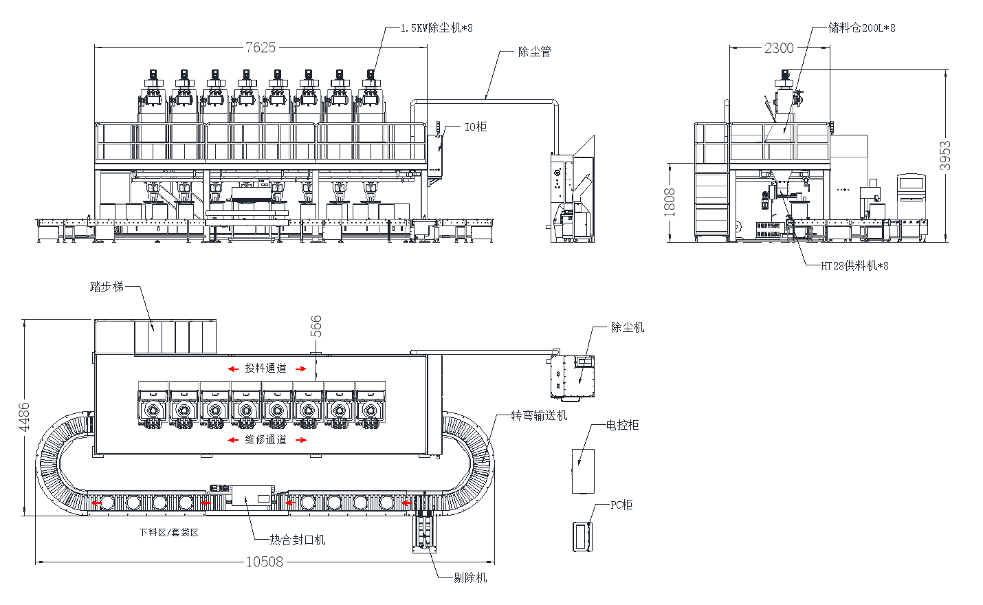 The WS8-9P-UT-BC consists of a material lift, a feeding bin, an HT28-38 feeder, a combined metering scale, a unloading machine, a manual batching scale, a heat sealing machine, a dust removal system, an industrial control computer and MES software, forming an intelligent small material batching system.